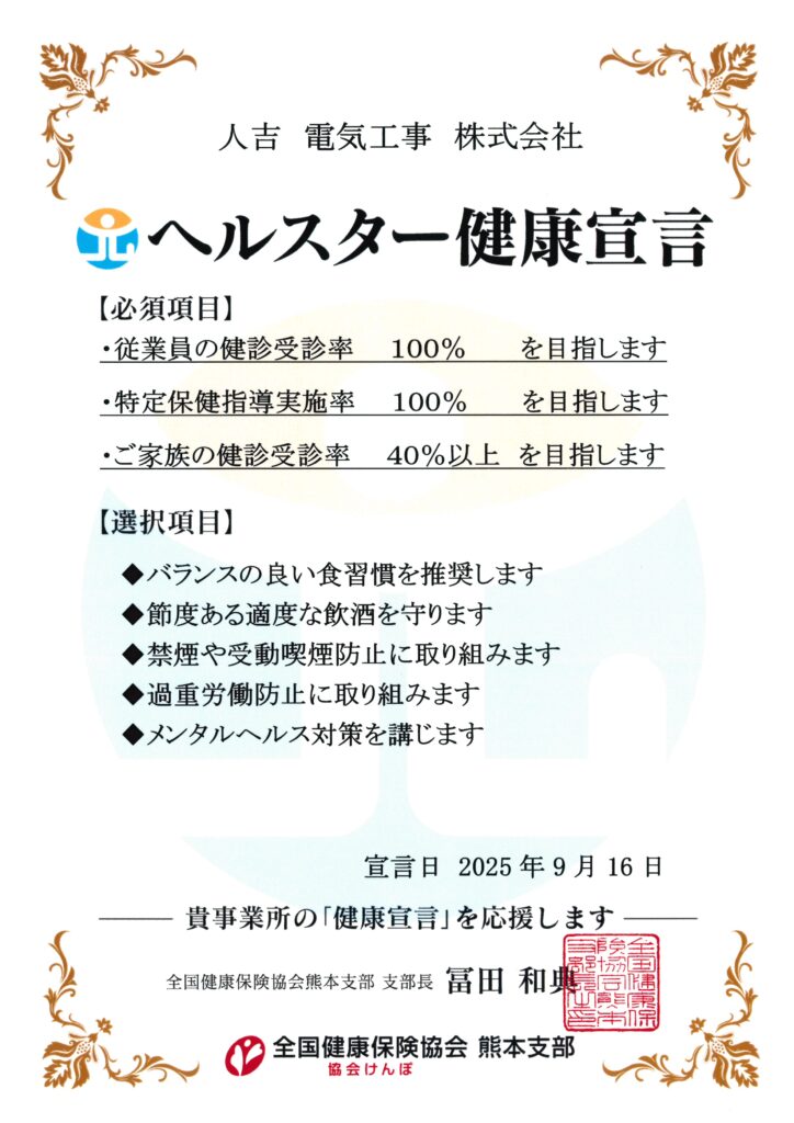 健康経営 2024.09.272025.11.05◆2025年(令和7年)「ヘルスター健康宣言」を更新しました2年ぶりに、ヘルスター健康宣言を更新しました。従業員の健康診断受診率は100%を維持していますが、2025年度の健康診断の結果『異常なし』が1名(全体の3%)です。この1名が来年は更に増えるよう目指します。「健康経営優良法人2025(中小規模法人部門)」に認定されました3年連続で、「健康経営優良法人2025(中小規模法人部門)」に認定されました。2025/3/12やっと最近、従業員の意識改革が浸透し始めたように思います。次へ 12345